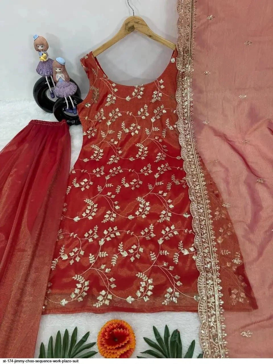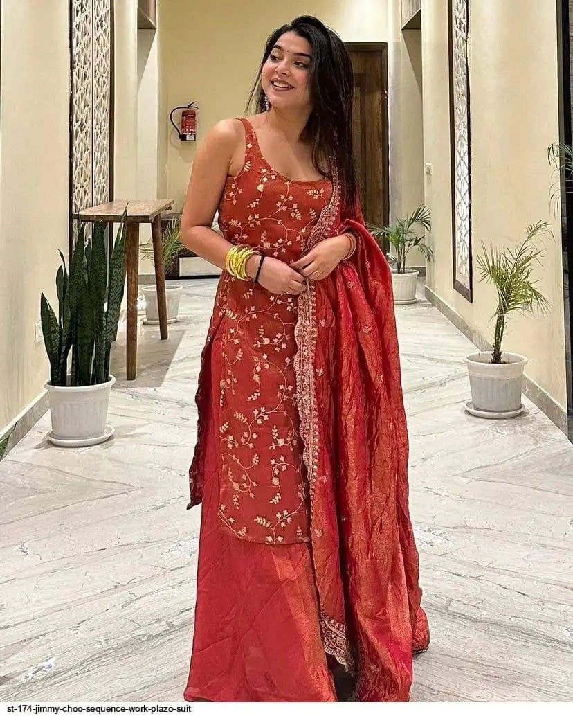 Add elegance to your wardrobe with this beautiful party wear suit set featuring intricate embroidery work and a graceful silhouette. Crafted in premium heavy Chinon fabric, this outfit includes a stylish embroidered top, matching plazo, and a designer dupatta with sequence work. Perfect for festive occasions, parties, and special gatherings.