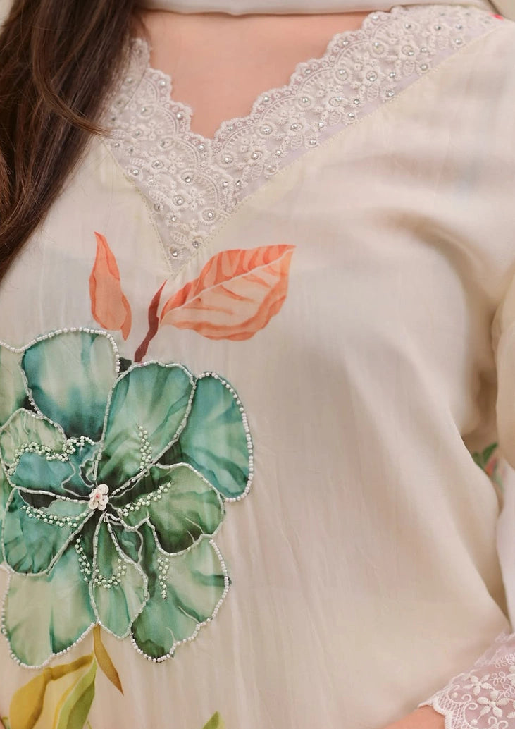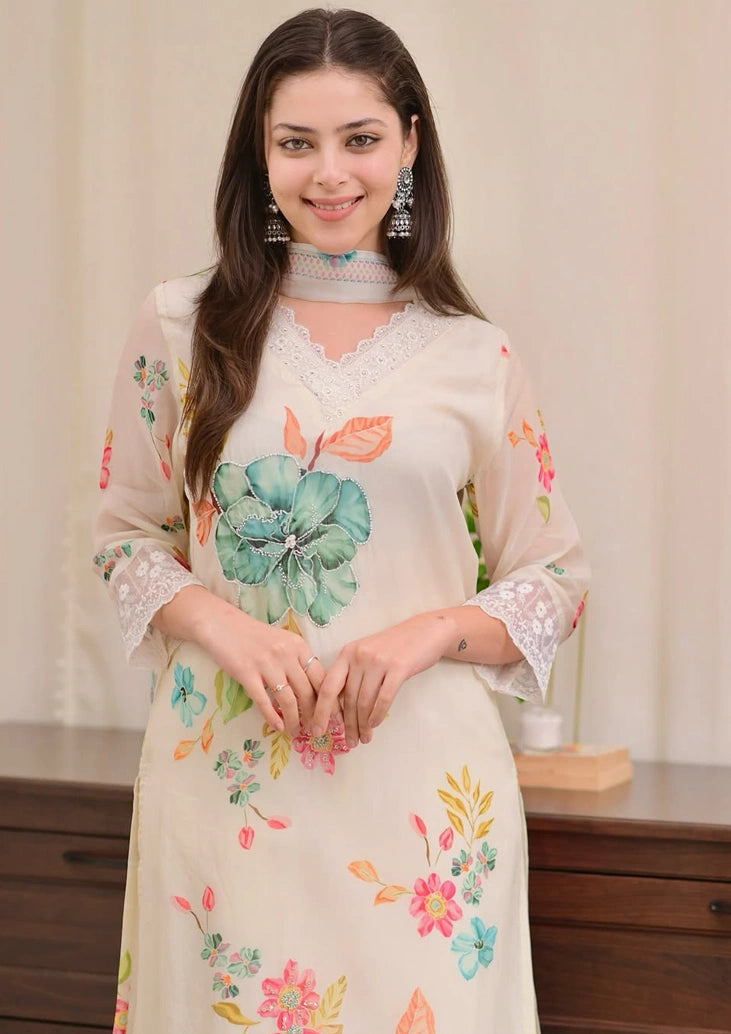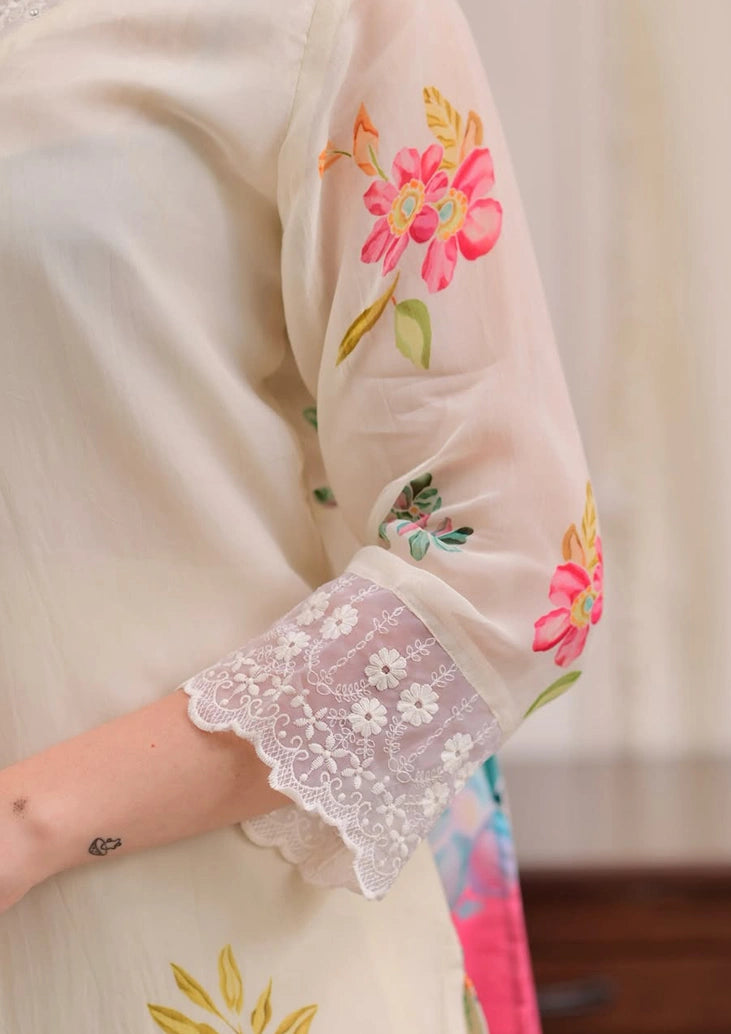 • Heavy Organza Top with digital floral printing, handwork detailing, and lace design at the neckline and bottom