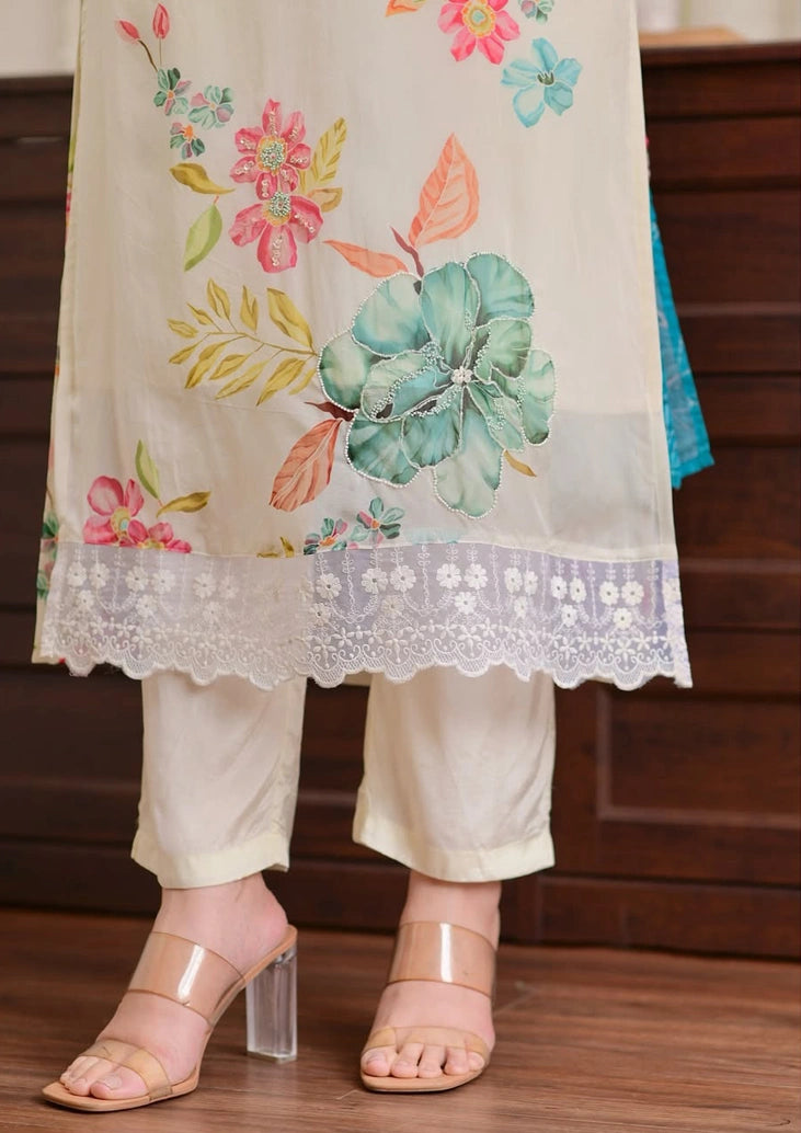 AnokhiVastra Suit Set with Digital Print, Handwork, Chanderi Silk Pants & Organza Dupatta