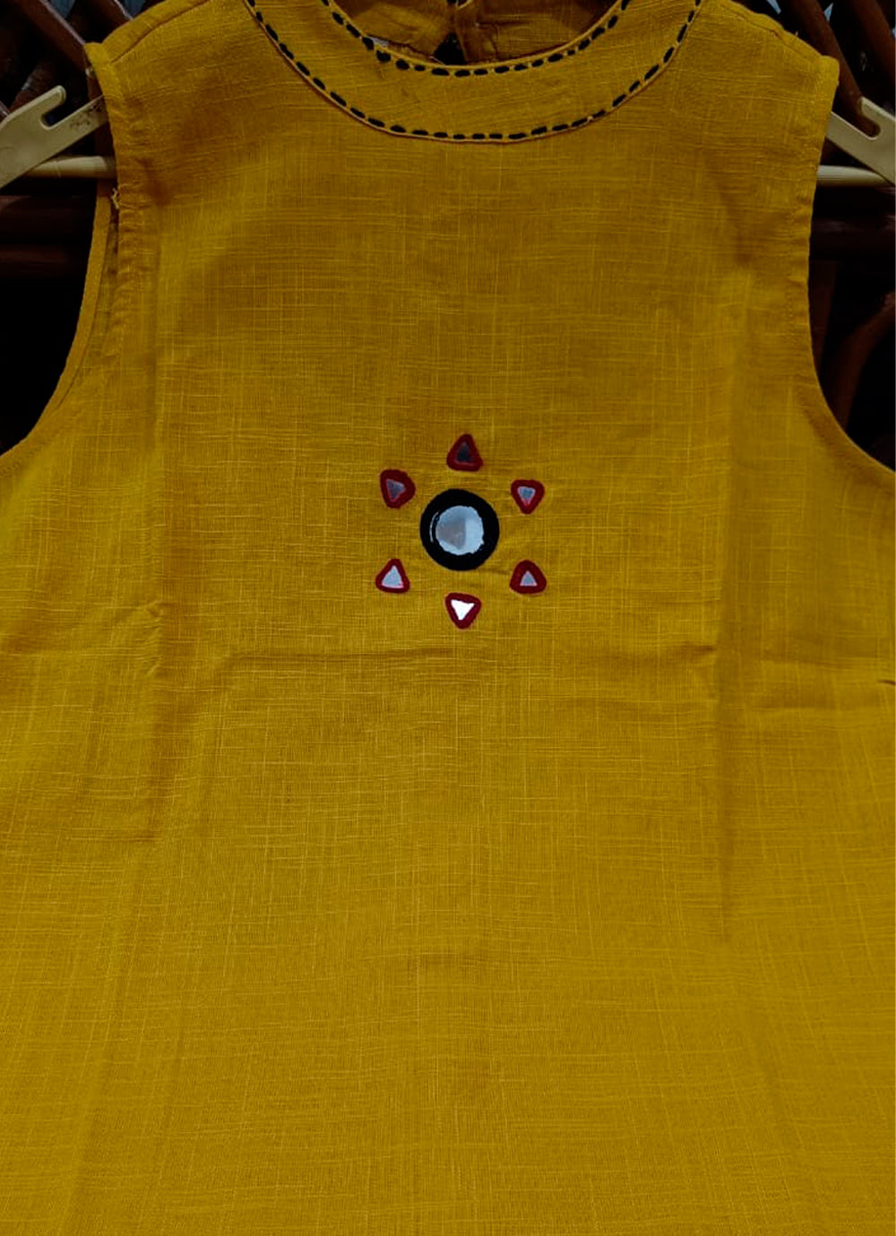 Presenting this beautifully designed A-line Cotton Slub Kurta Set, crafted for both comfort and elegance. The kurta features delicate neck embroidery with mirror work on the chest, complemented by a convenient side pocket for added practicality.
