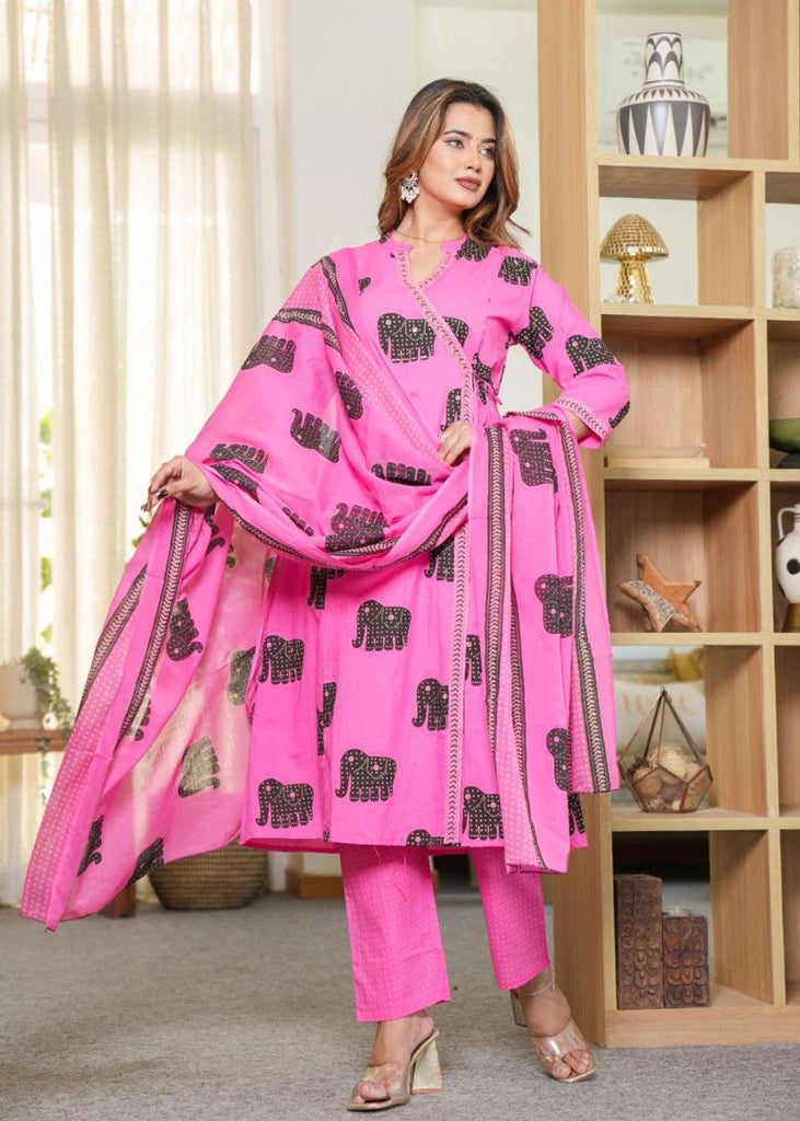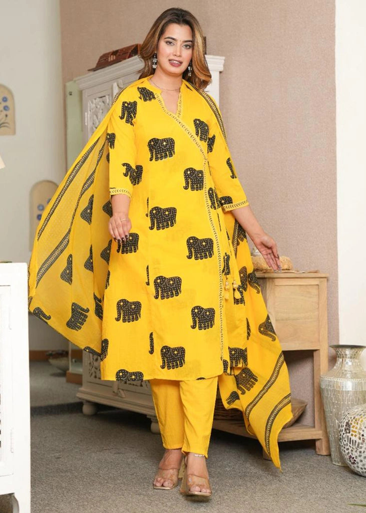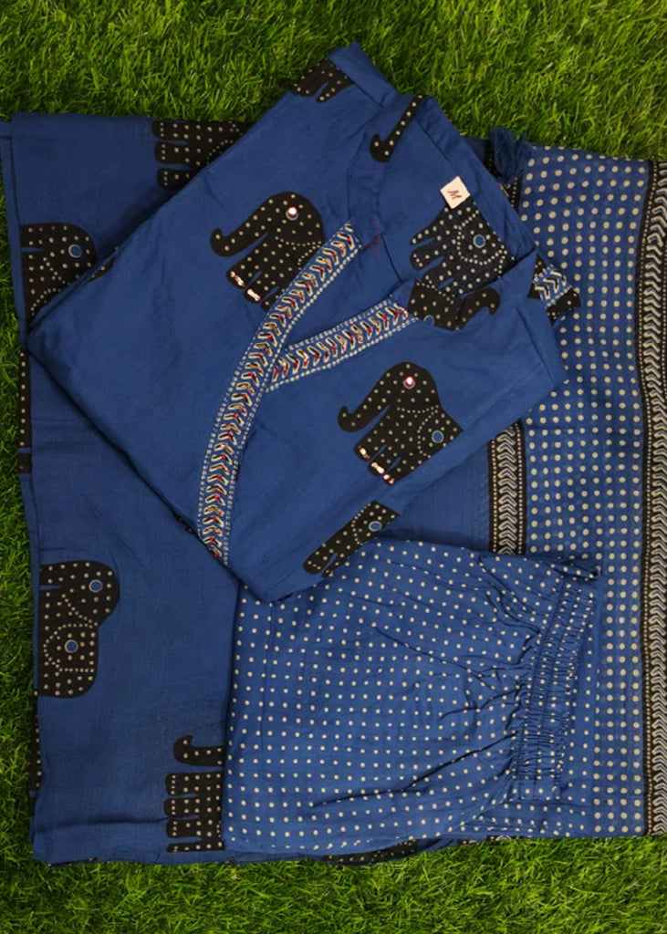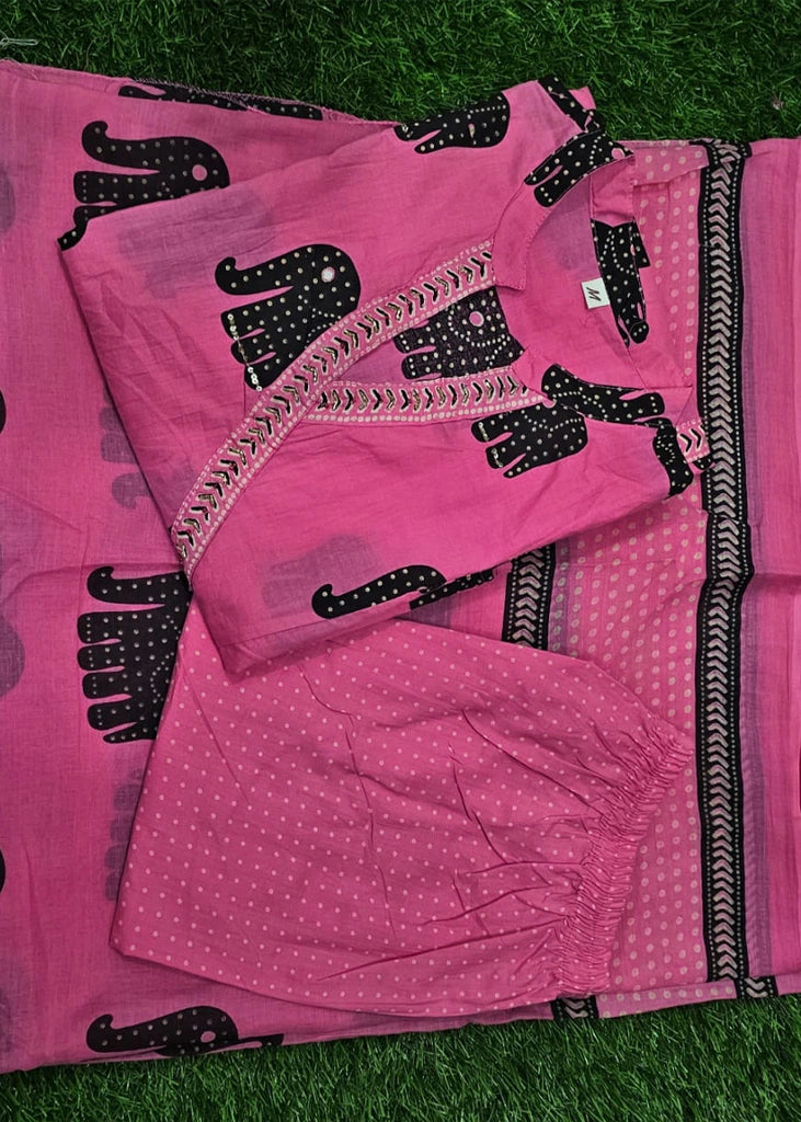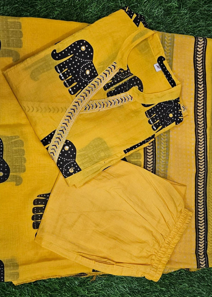 Women Cotton Elephant Print Kurta Set with Dupatta