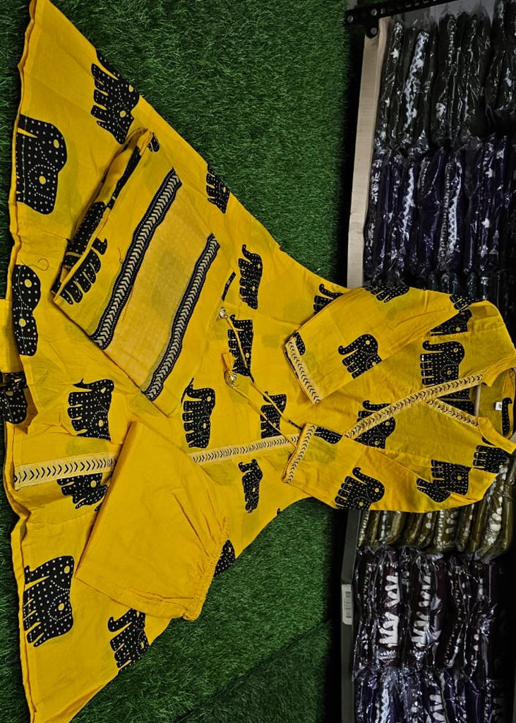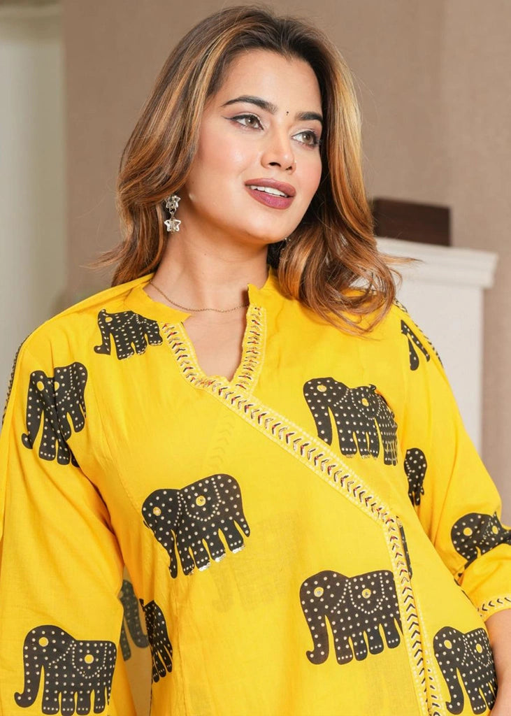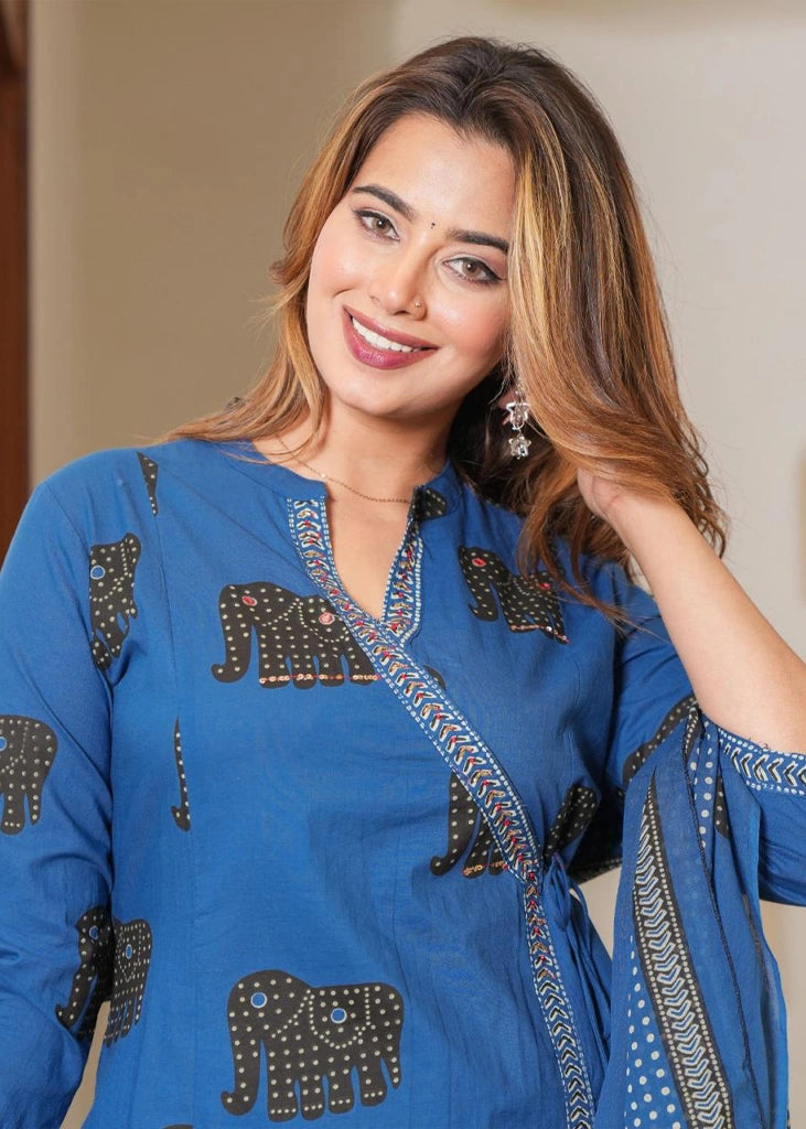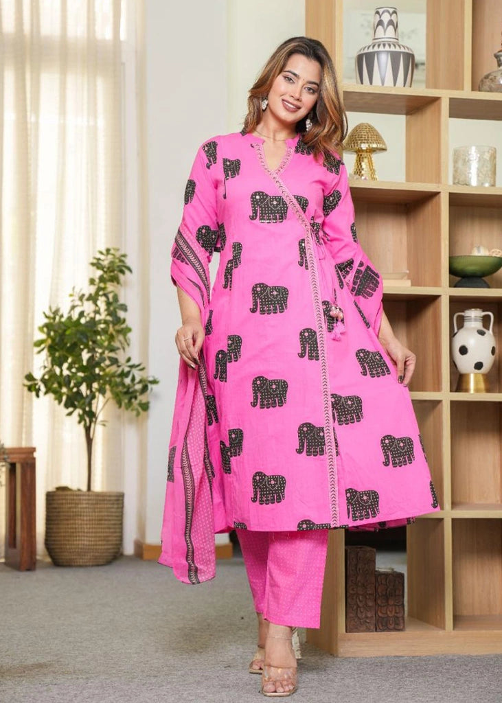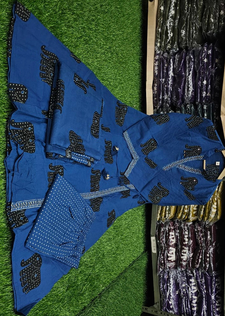 Women Cotton Elephant Print Kurta Set with Dupatta