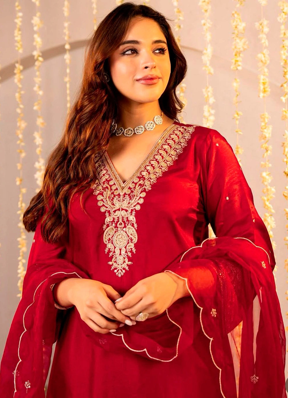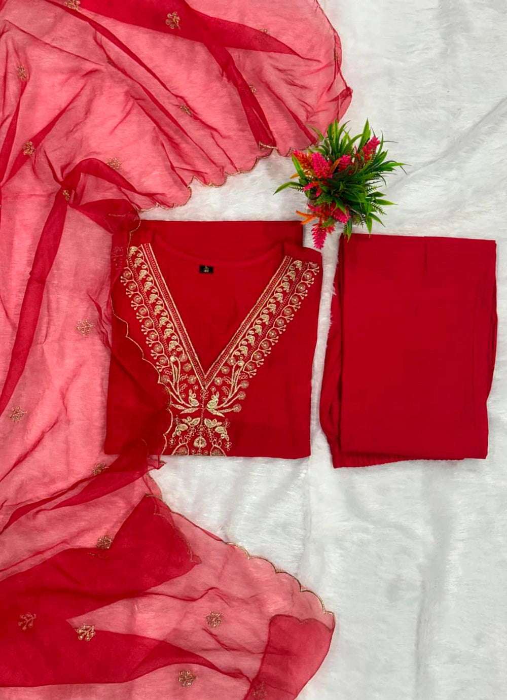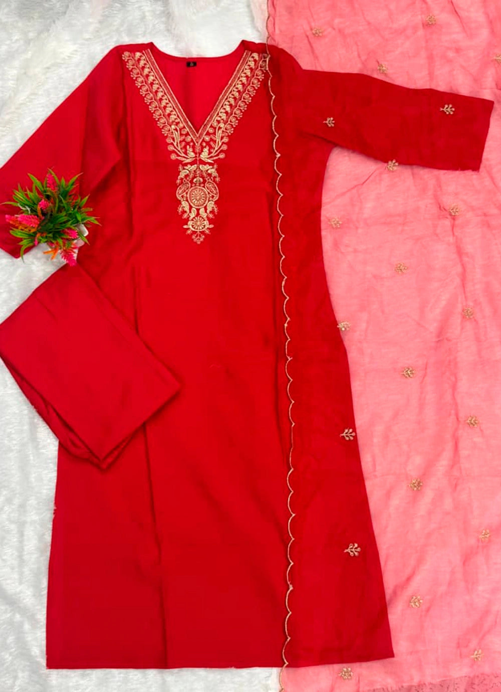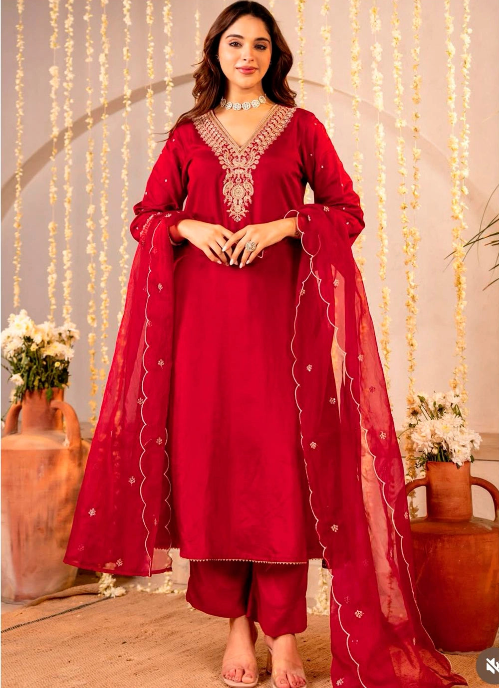 Women Elegant Red Roman Silk Kurti Pant Dupatta Set