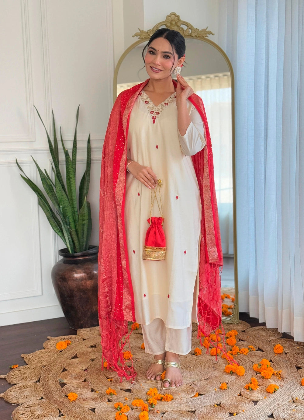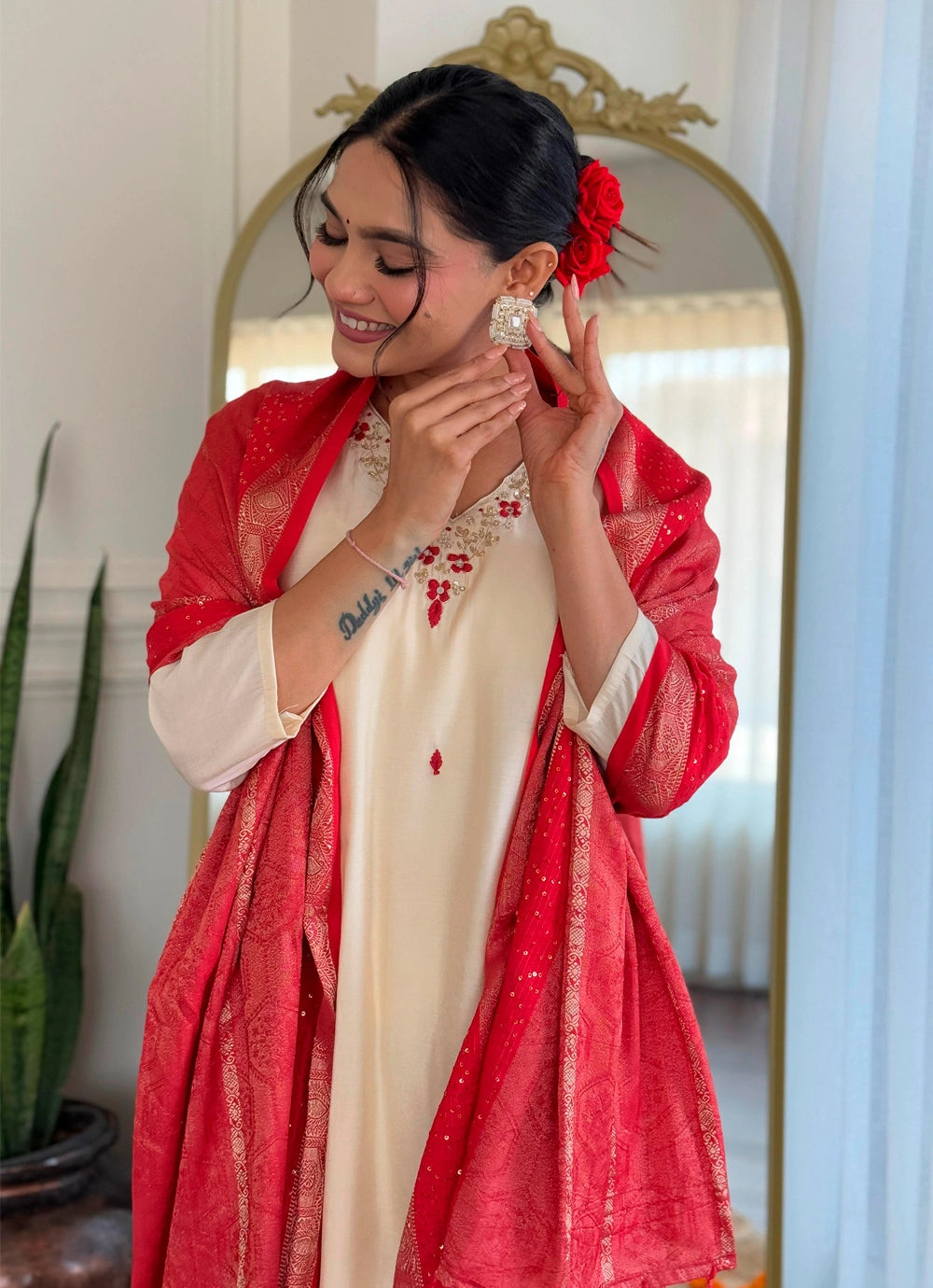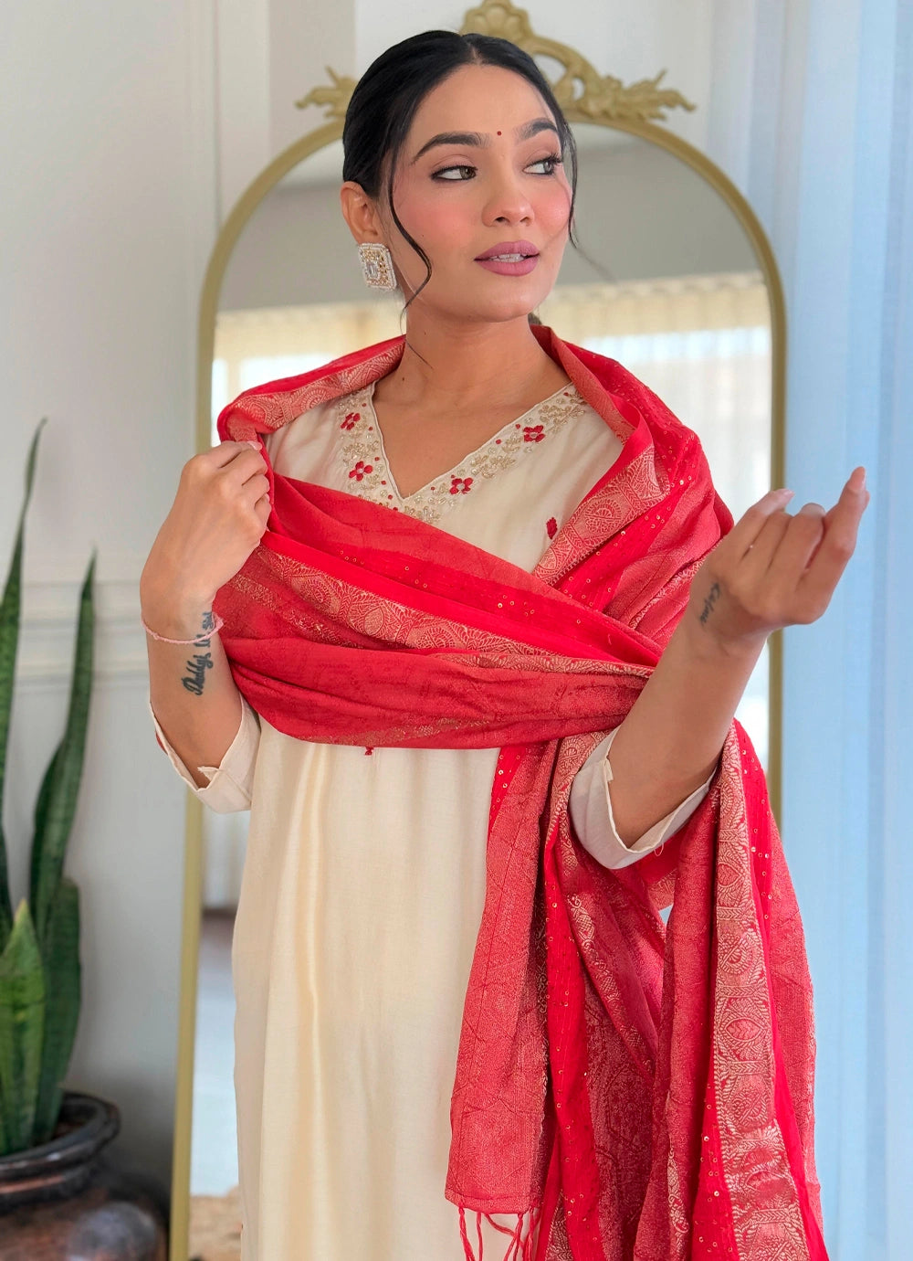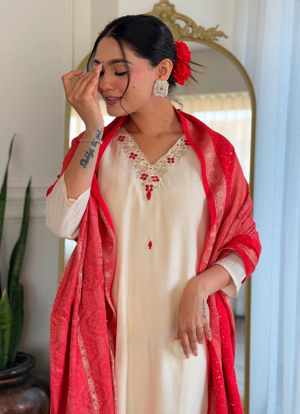 This premium set features a Roman silk kurti adorned with exquisite multi-sequence handwork on the neckline, paired with a matching pant and a vibrant red long dupatta that adds a regal touch. Designed with our “Never Compromise with Quality” concept, every piece promises unmatched craftsmanship and lasting comfort.