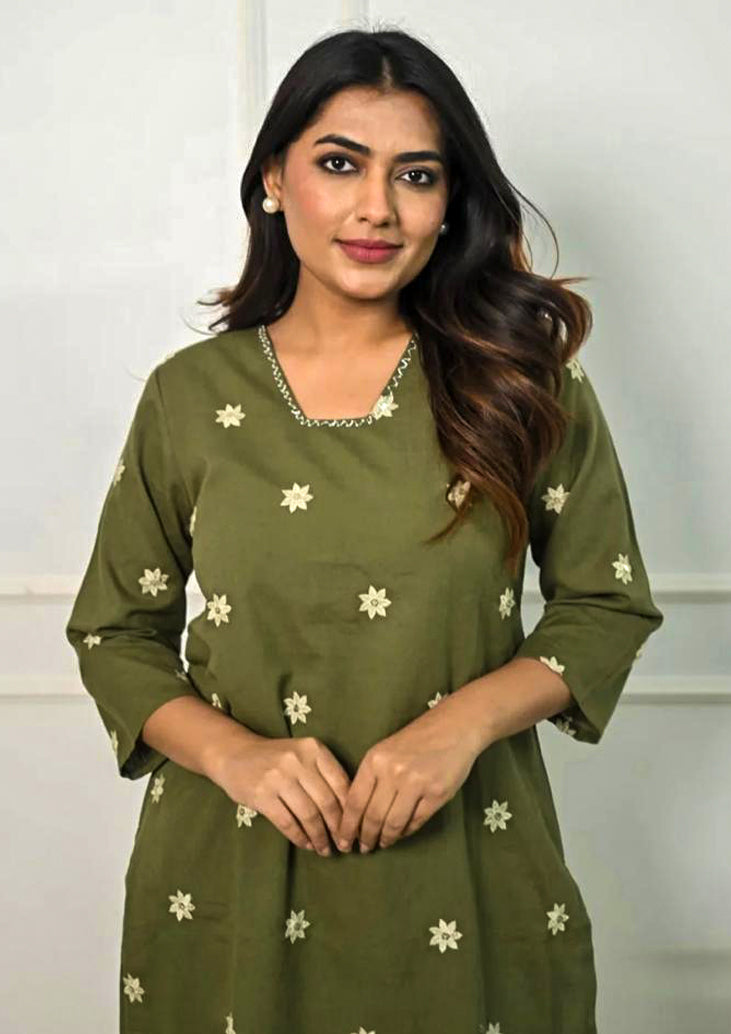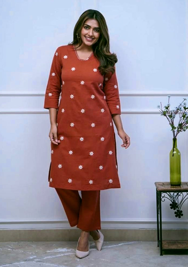 Upgrade your office wear wardrobe with this classy kurti and pant set, featuring intricate embroidery and manual work detailing. Designed for all-day comfort and a trendy look.