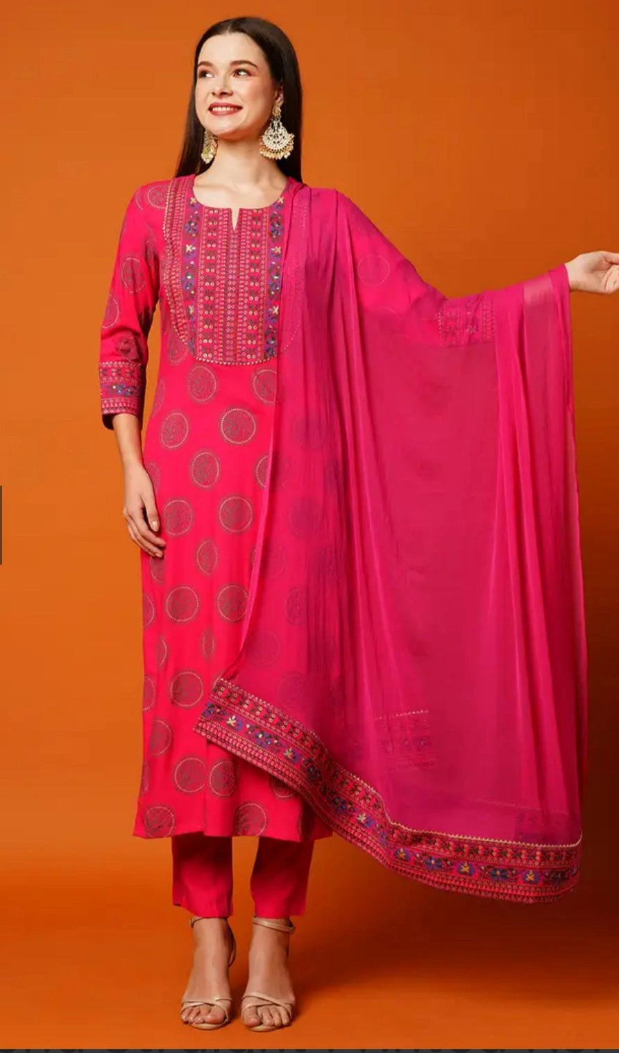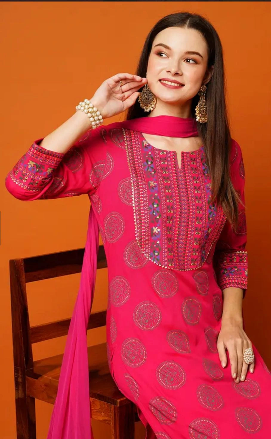 Upgrade your ethnic wardrobe with this elegant three-piece set crafted in premium rayon fabric. This stylish outfit features a beautifully designed kurti with detailed neckline work, paired with comfortable pants and a matching dupatta. Perfect for daily wear, office, and casual outings while offering both comfort and graceful style.
