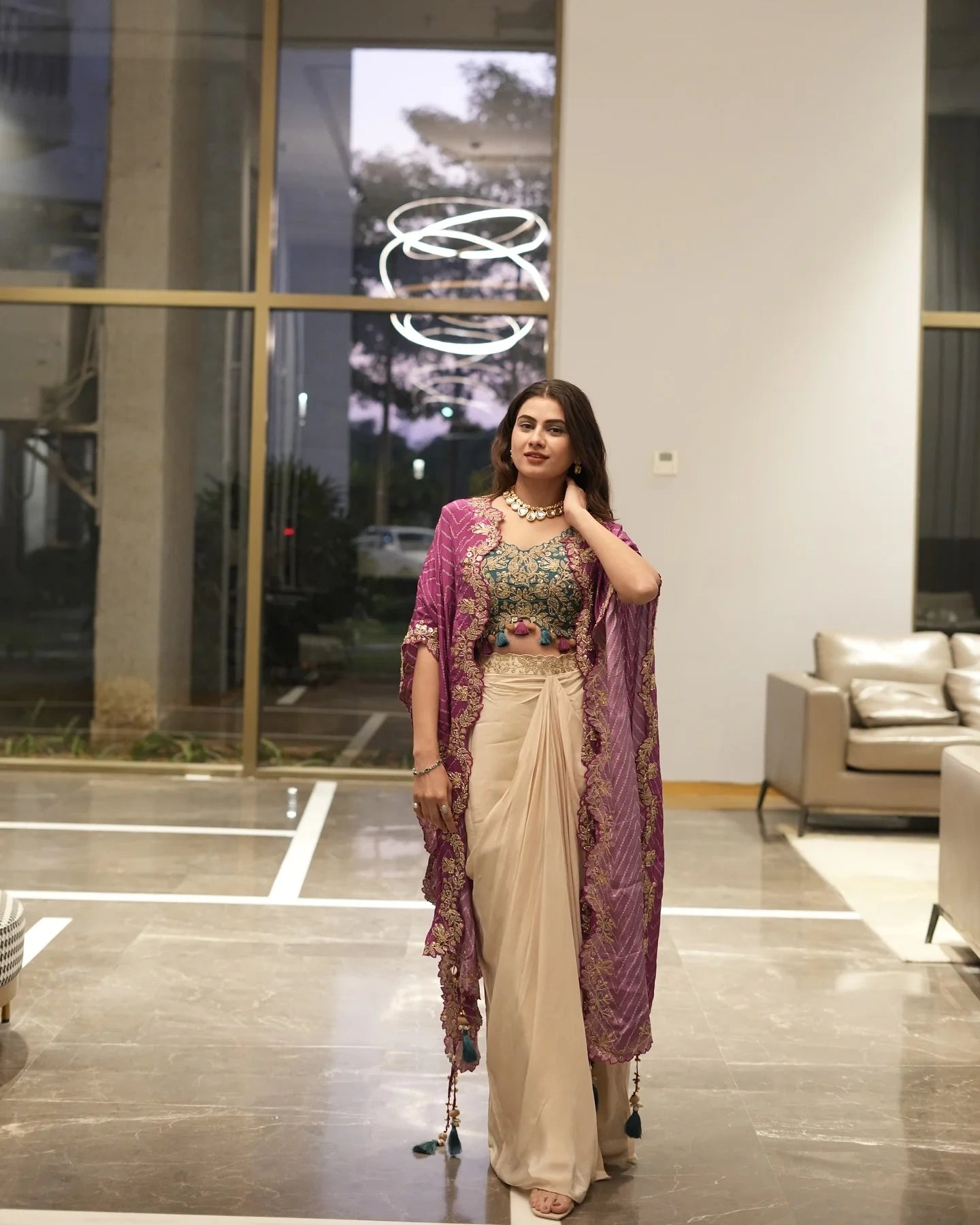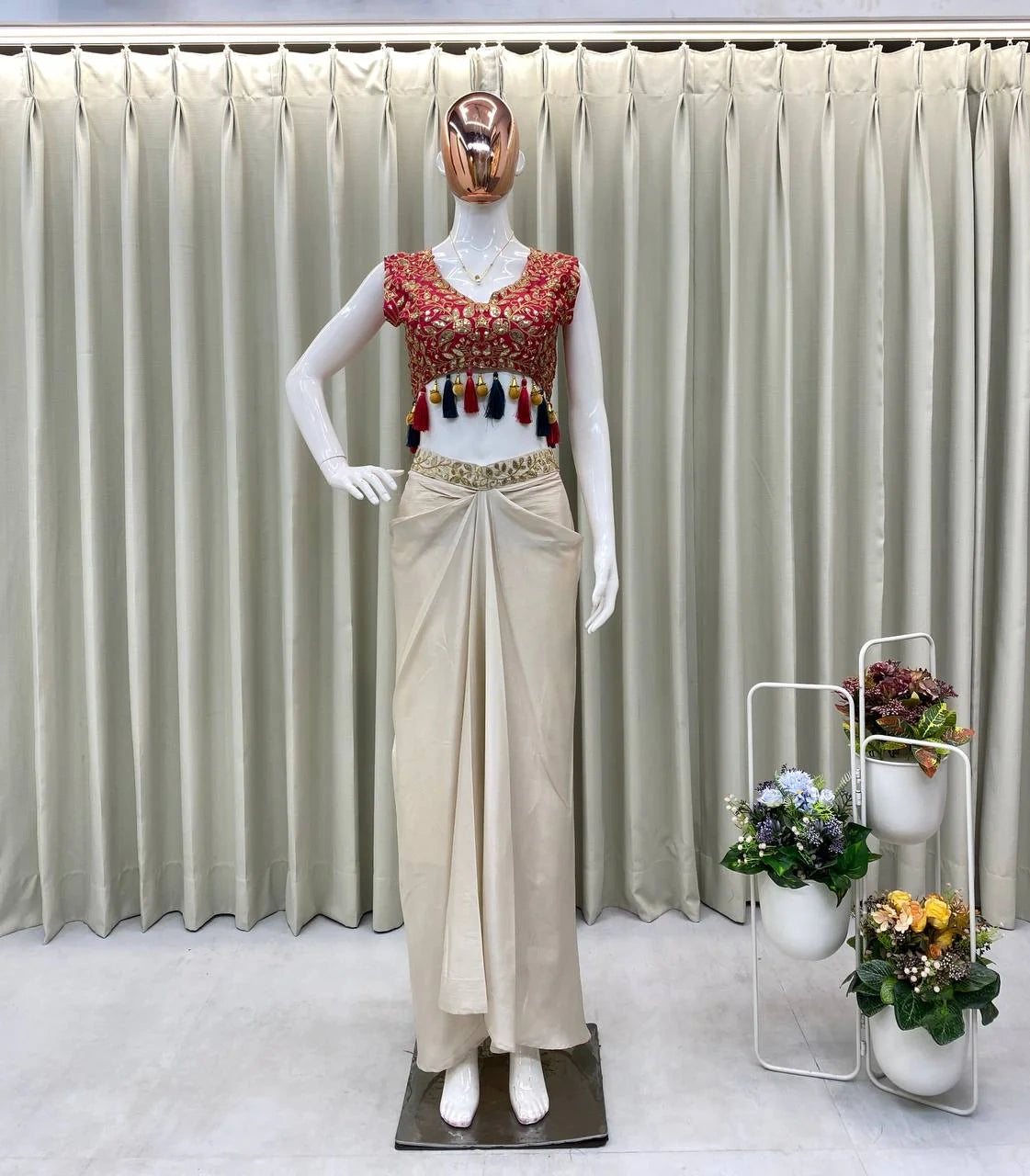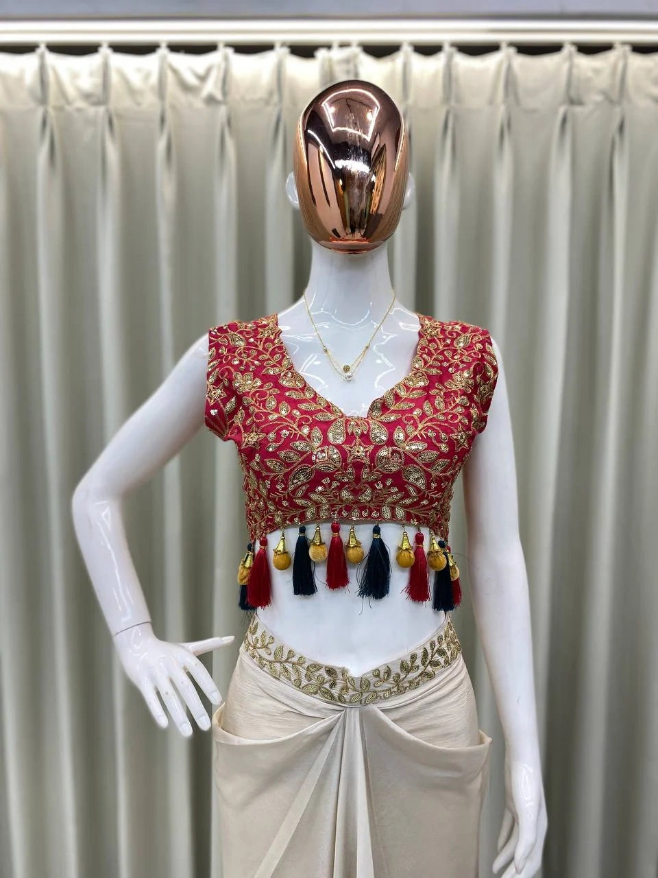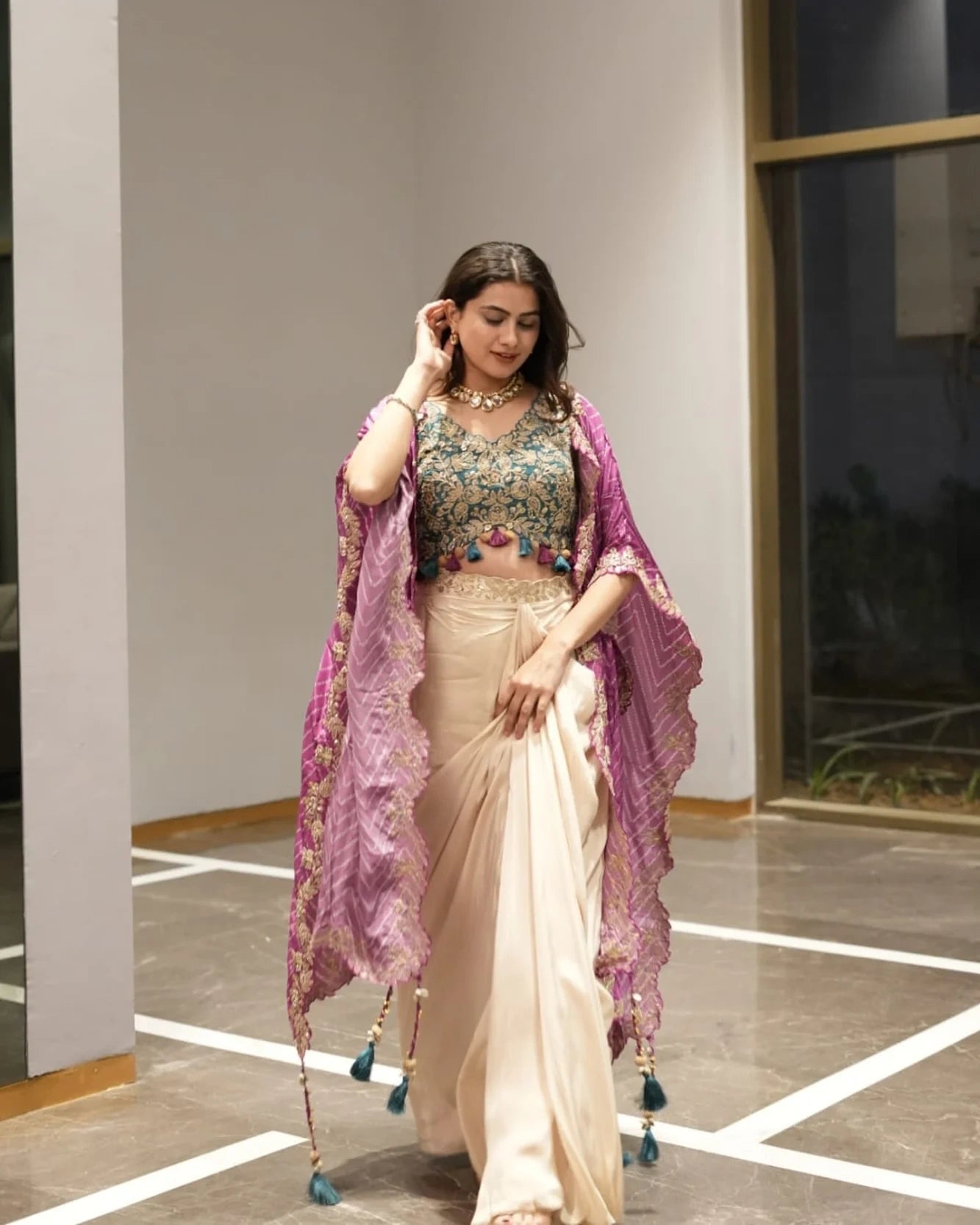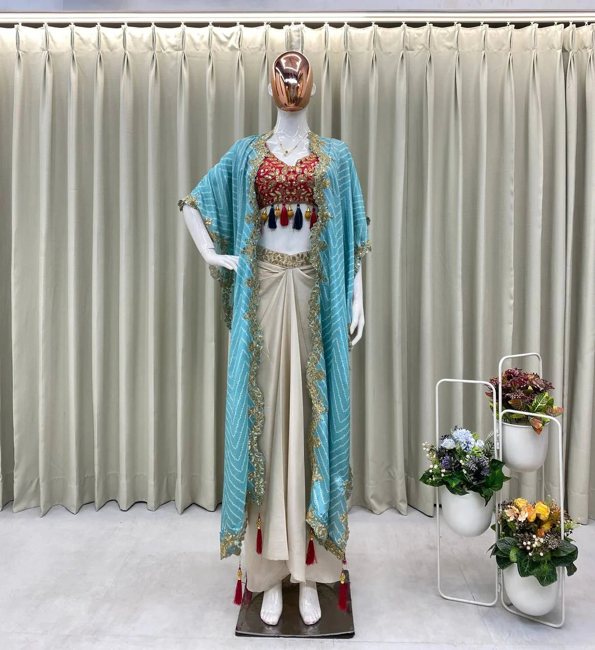 The set features a beautifully crafted mono silk tube blouse adorned with intricate sequin embroidery and delicate front latkans, paired with a fluid draped crepe silk skirt that offers both comfort and graceful movement. Completing the look is a statement chinon shrug, enhanced with sequin embroidery and latkan detailing at the corners — adding an effortless layer of elegance.