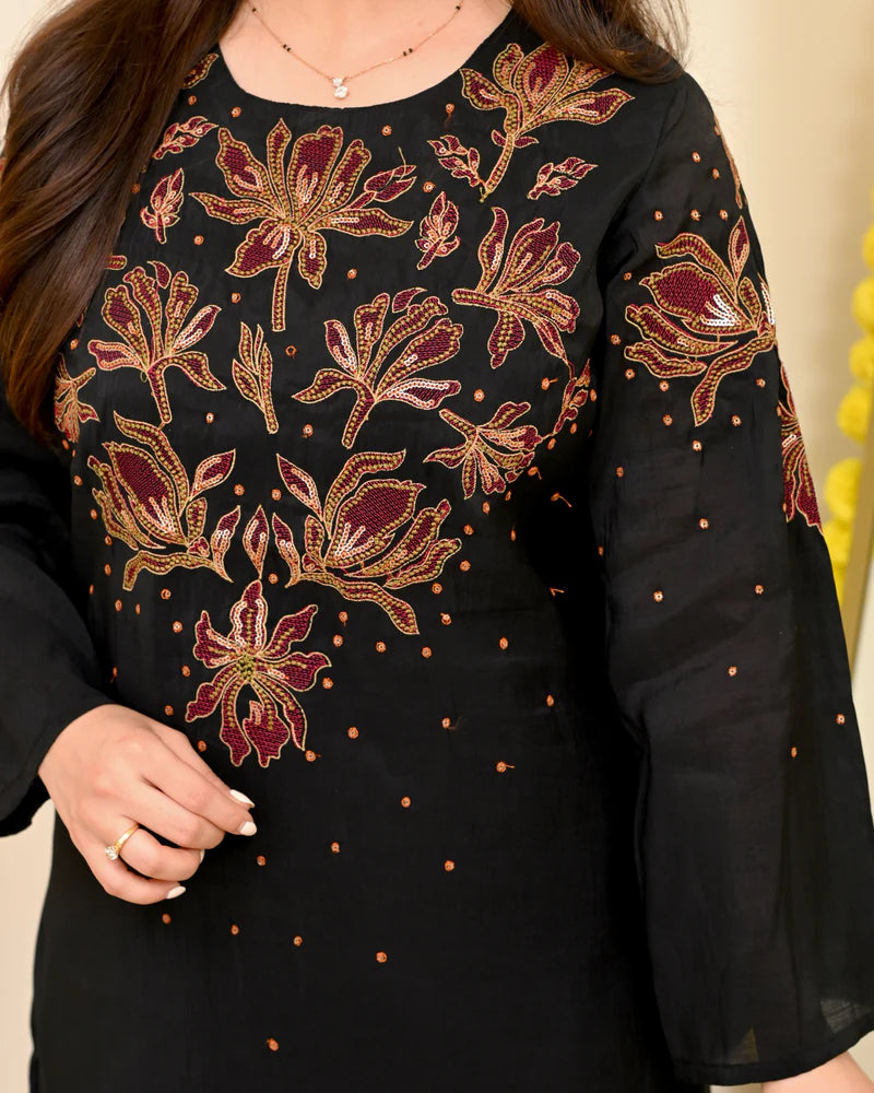 Upgrade your wardrobe with our elegant Pure Cotton 60×60 Embroidered Co-ord Set. Designed for comfort and style, this set features beautifully detailed thread embroidery on both the kurti and pants, giving you a refined and classy look suitable for any occasion.
