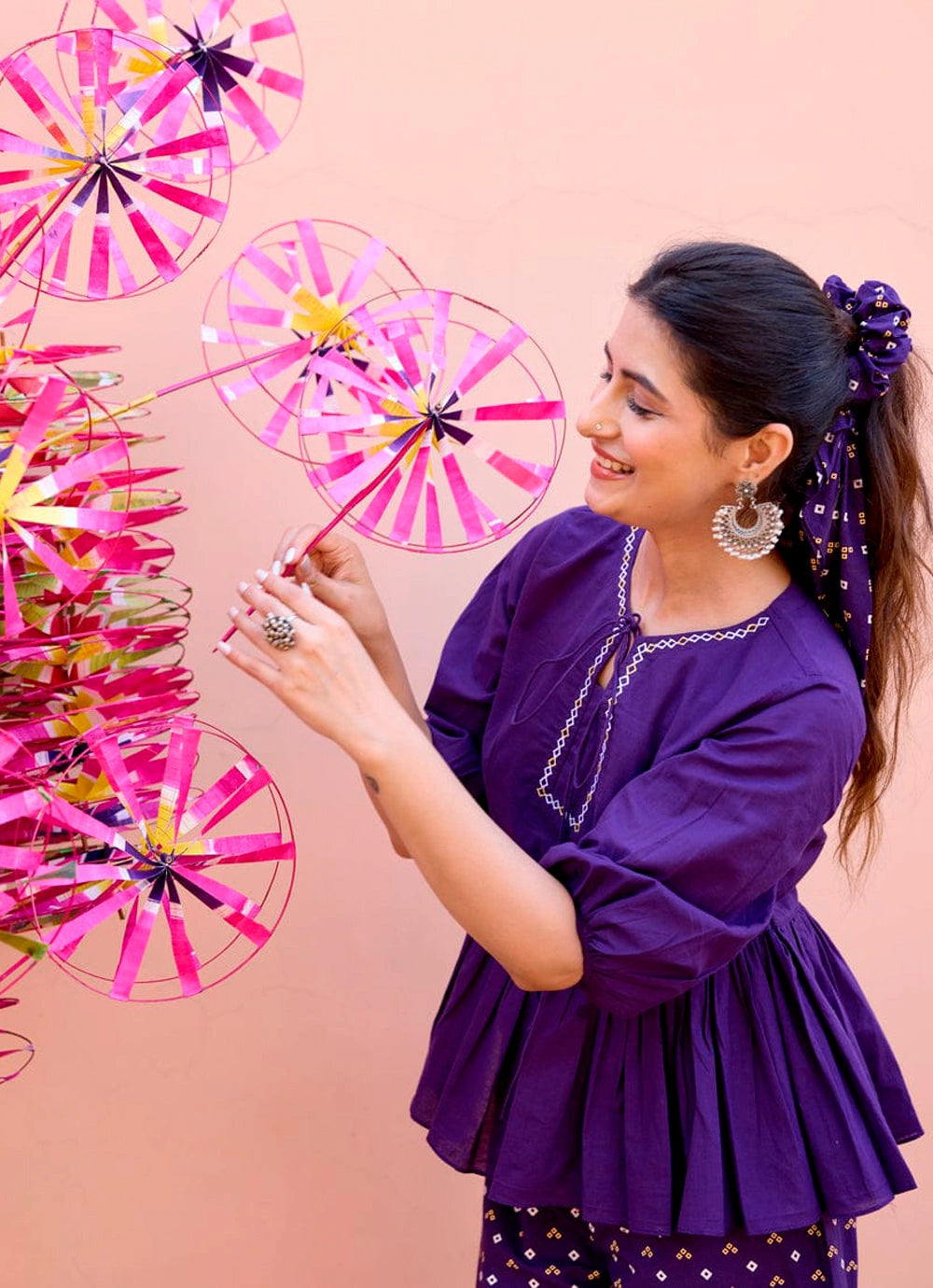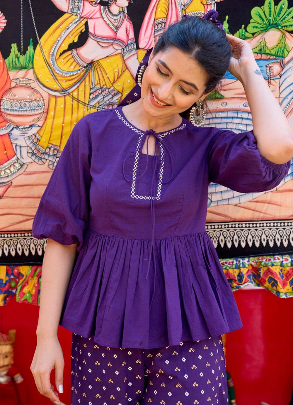 The embroidered detailing on the top adds a subtle charm, making it perfect for both casual outings and festive gatherings. With its breezy silhouette and rich purple hue, this co-ord set is your go-to outfit for a sophisticated yet relaxed summer look.