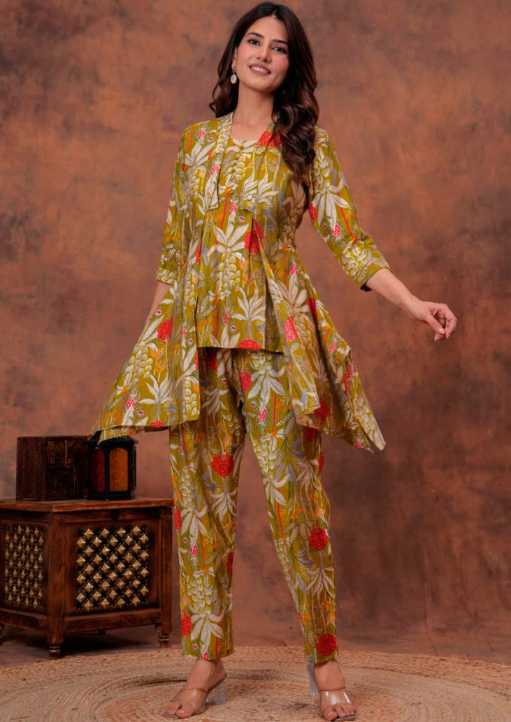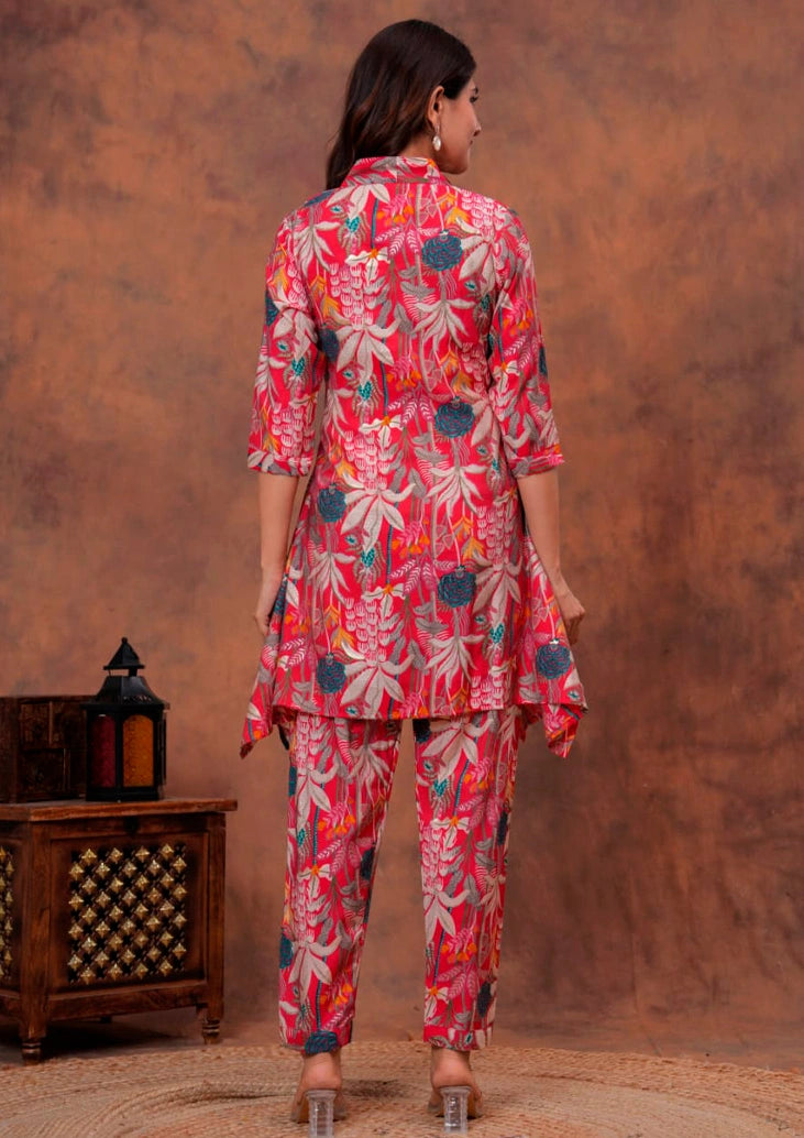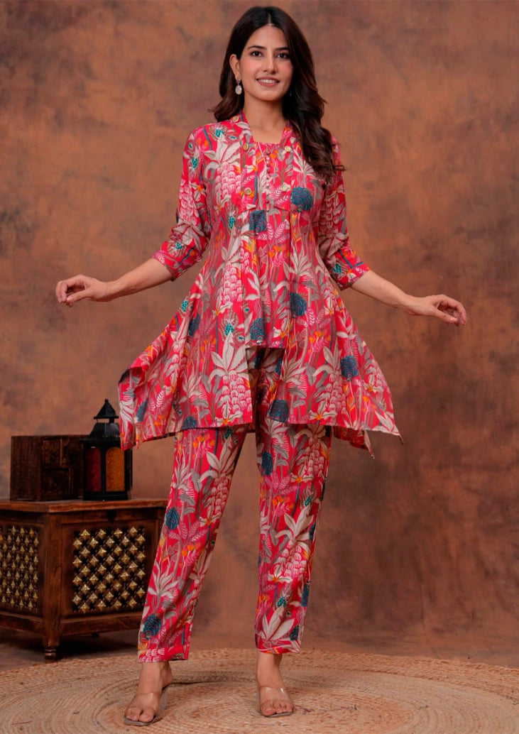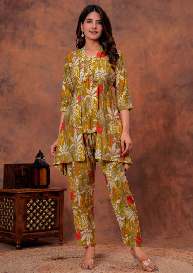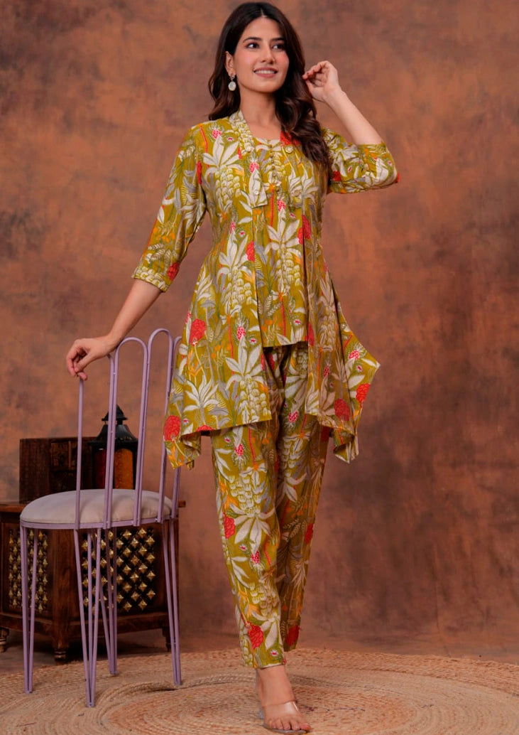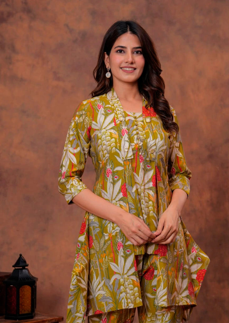 Upgrade your festive and party wardrobe with this 2-piece co-ord set crafted from luxurious muslin fabric. Designed with a stylish butterfly jacket style top and paired with comfortable matching pants, this outfit blends elegance with ease.