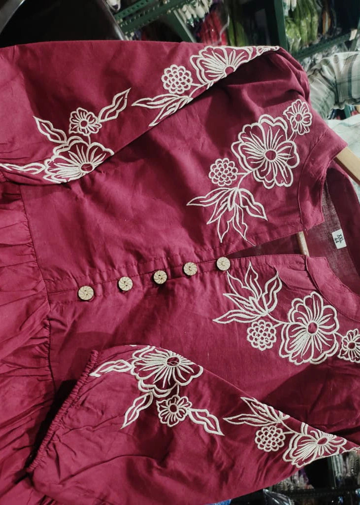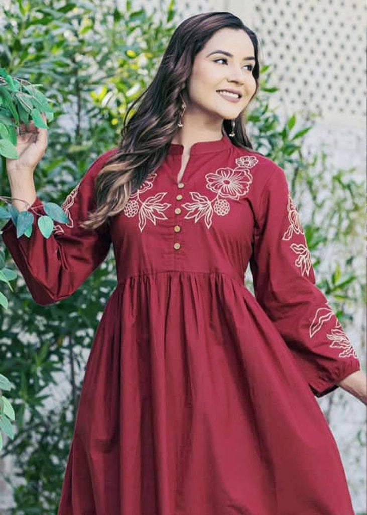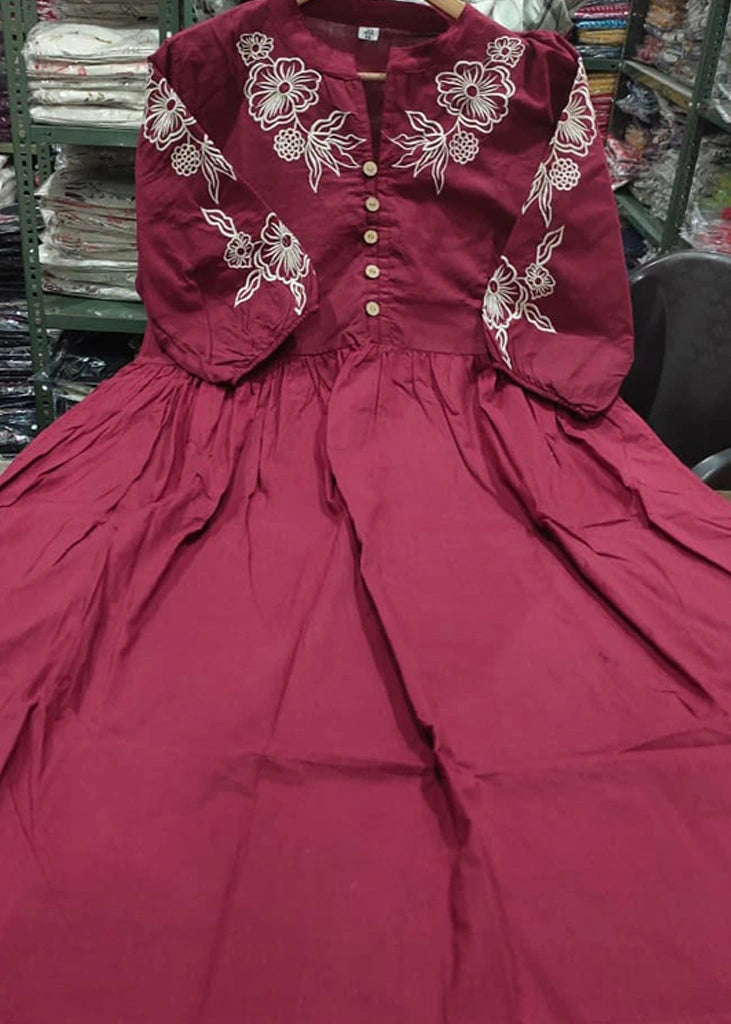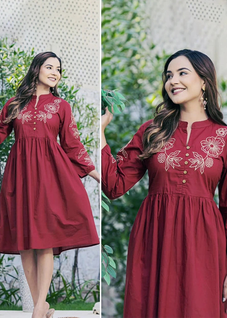 Step out in elegance with this Maroon Cotton Embroidery Midi Dress – a timeless addition to your fashion collection.