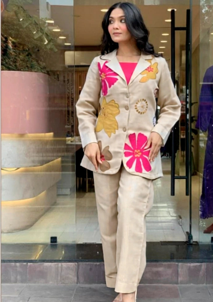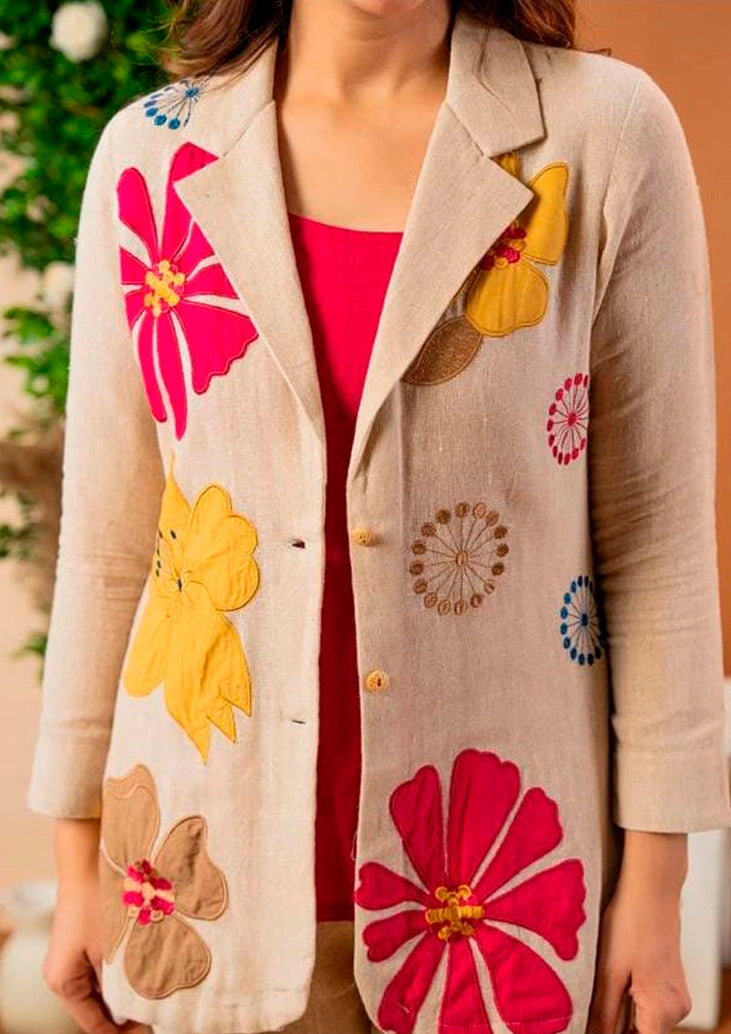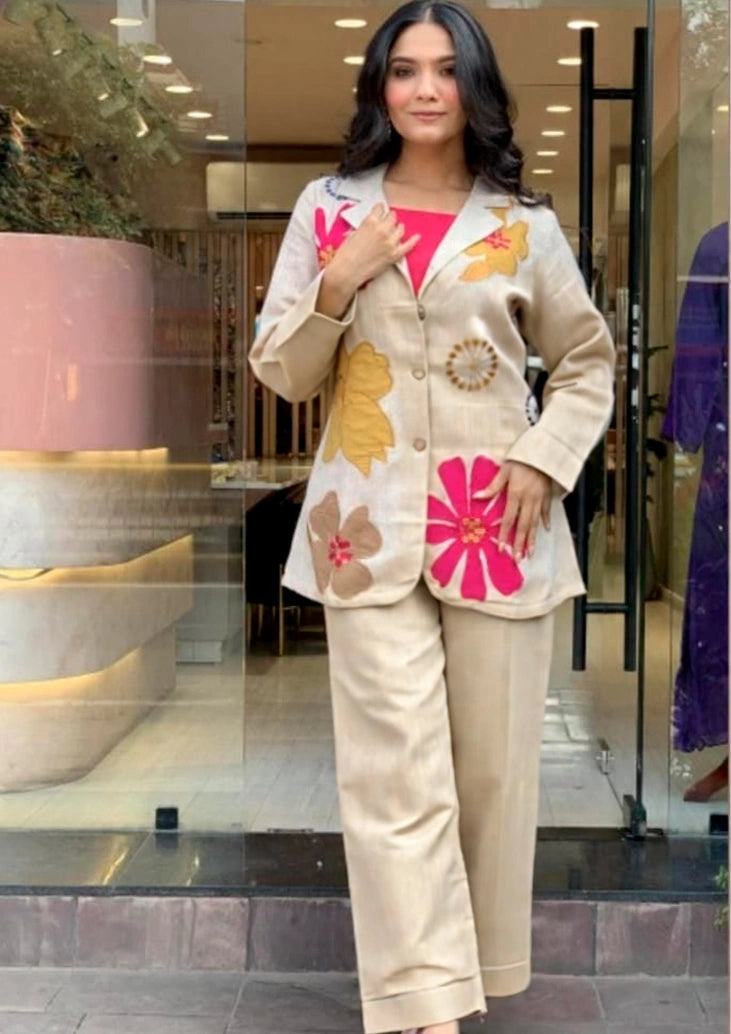The highlight is the blazer, adorned with bold, colorful floral appliqués and intricate embroidery, giving it a fresh, contemporary appeal.